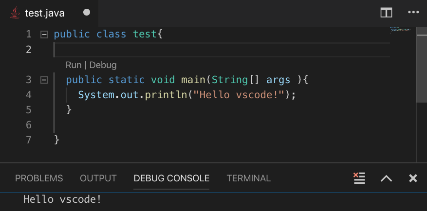 复制代码大功告成,现在你可以在 vs code 下创建一个 test.java 开始写 Hello vscode! 了。